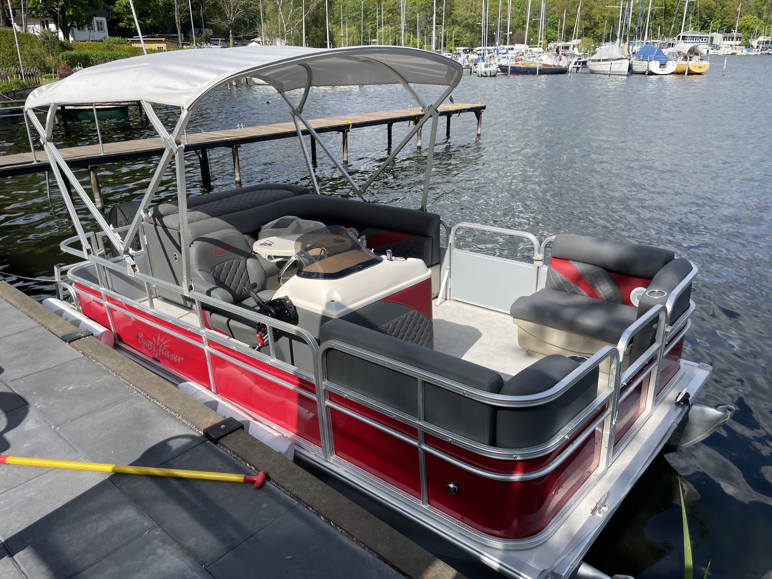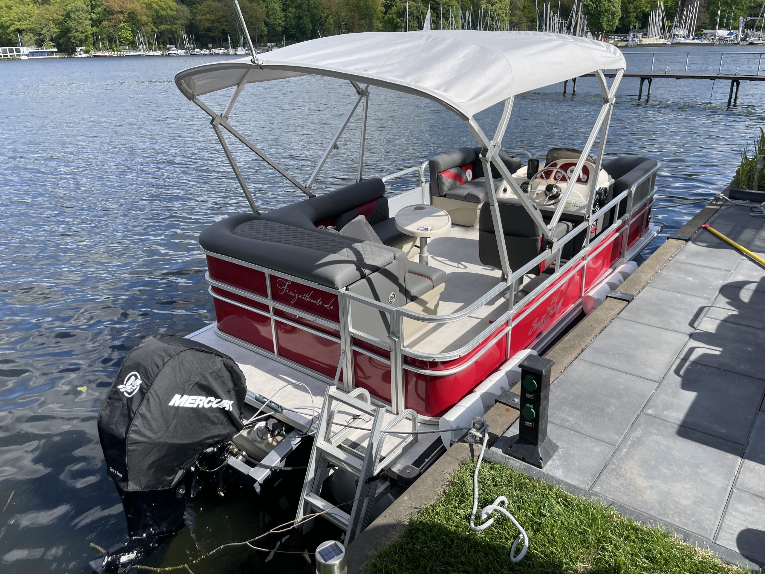 – Sun Lounger 500 (kleines 5m Pontonboot für max 6 Personen. Ideal für eine Familie zum Baden, Liegen und Sonne tanken.) ab 21900 €